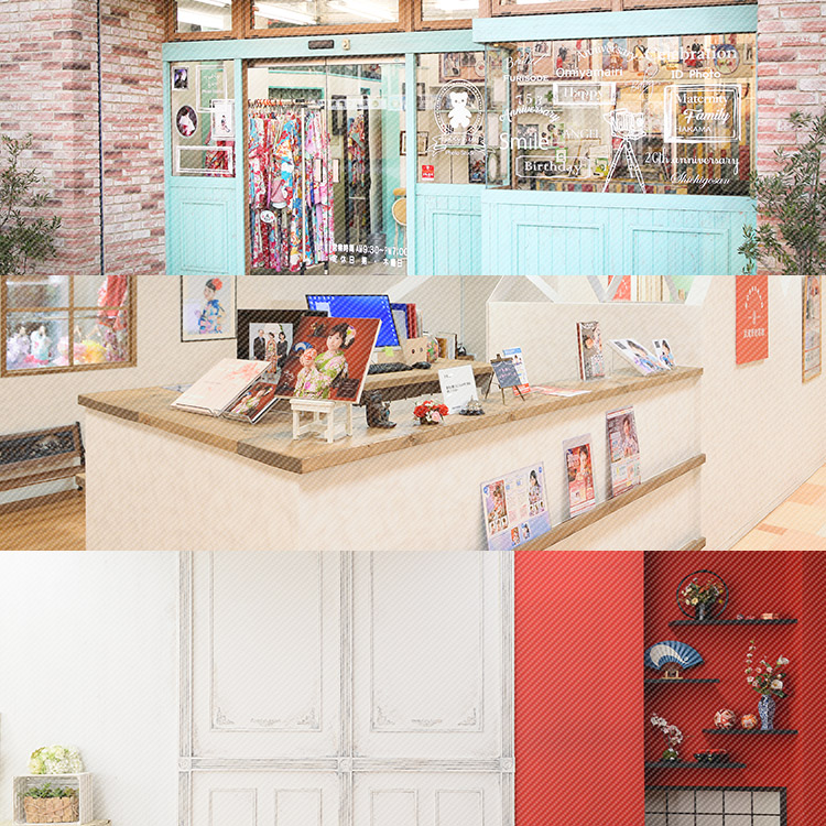 私たちは、「スタジオ撮影」「衣装・メイク・ヘアセット」「アルバム制作」、3つの機能を兼ね備えた「総合写真館」です。総合写真館の魅力は、ヒト、バショ、モノ、すべて揃っていること。記念写真のことなら、私たちにすべてお任せください。