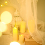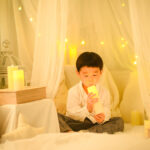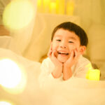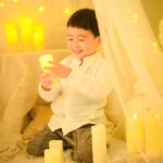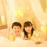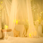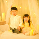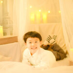 間接照明の暖かい光を活かしたロマンチックなフォトブースで、今だけの記念写真を撮影します。