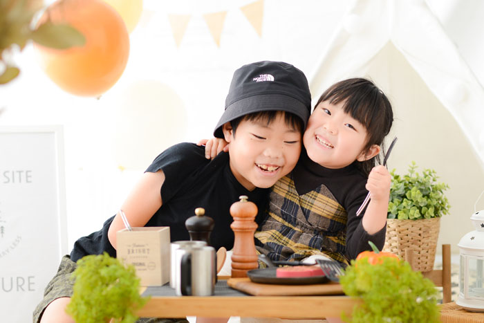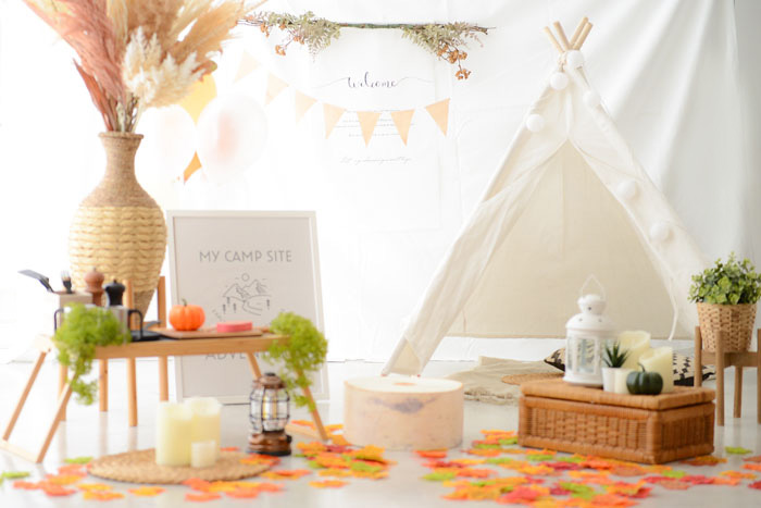スタジオの扉を開けると・・・そこはまるで秋の森!切り株に座りながら紅葉を眺めたら、キャンプごはんを作ってテントでひと休み♪秋カラーのガーランドや風船でコーディネートし、秋満開のフォトブースに仕上げました。